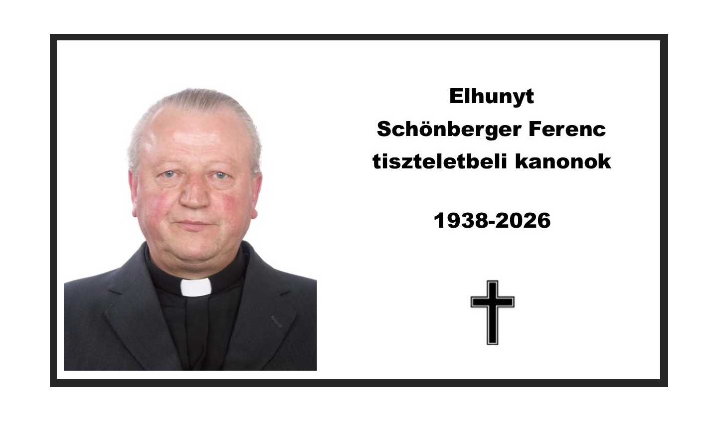 2026. február 6-án, életének 88., papságának 62. évében elhunyt Ft. Schönberger Ferenc tb. kanonok, ny. plébános – közölte a Szatmári Római Katolikus Egyházmegye hivatalos oldala.