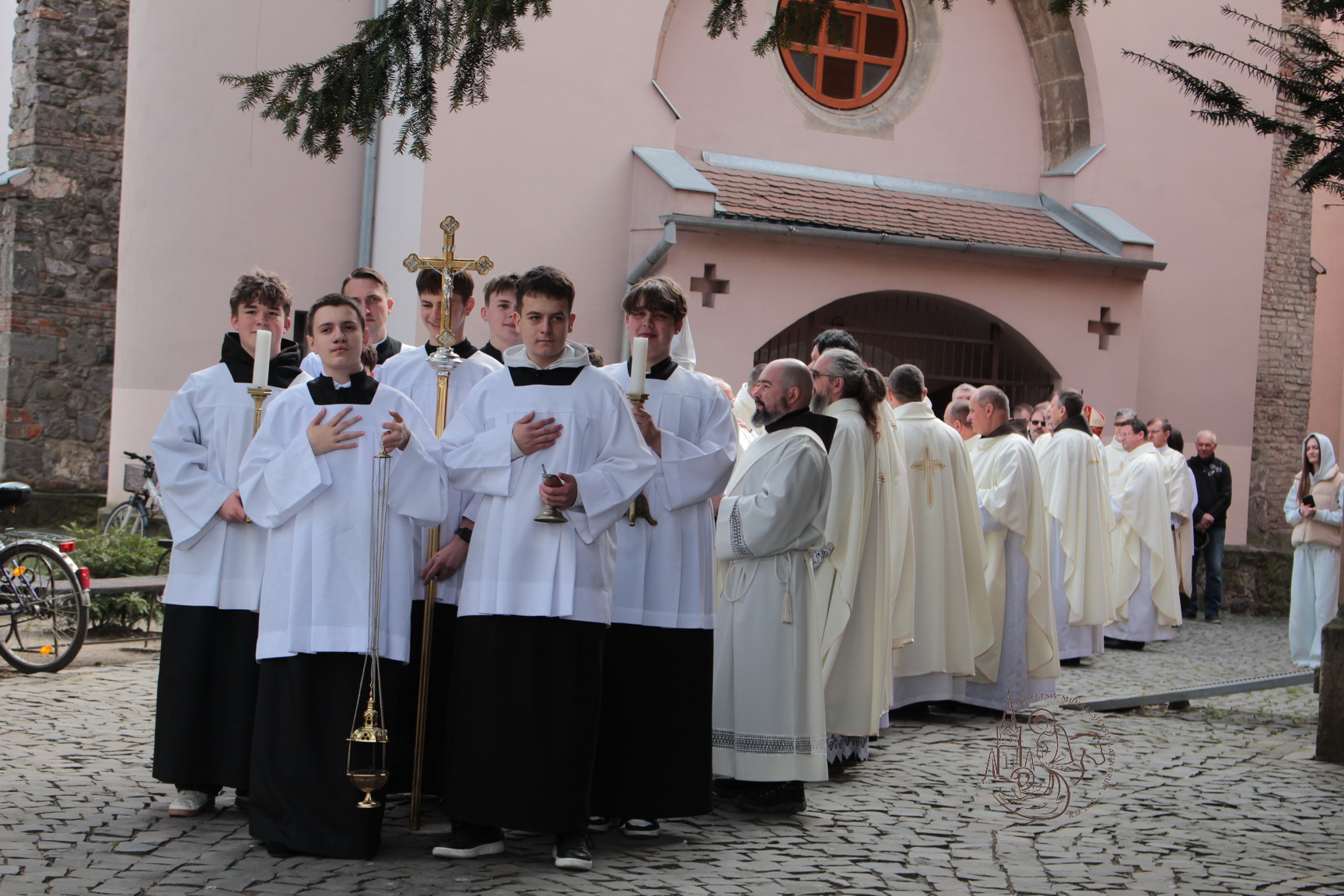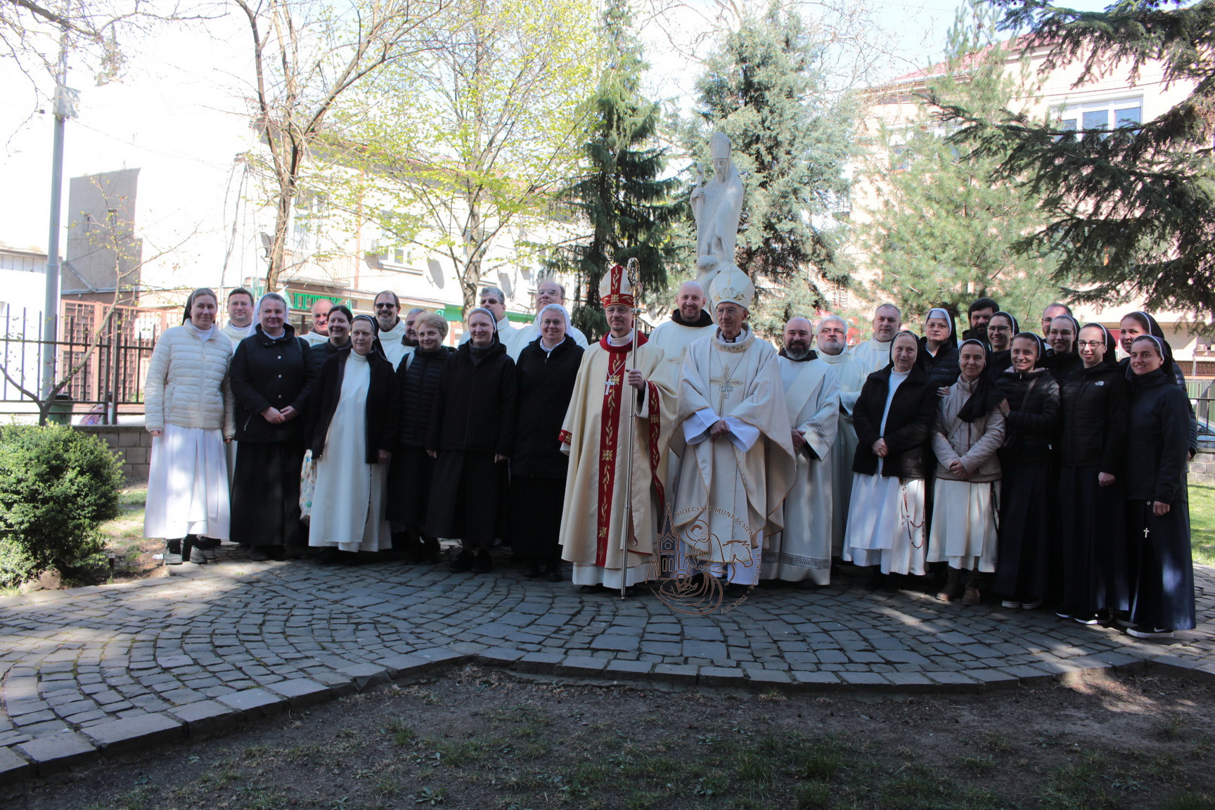 A liturgia után, a templom udvarán a szerzetesek és szerzetesnők a püspökkel együtt közös fényképet készítettek a magyarországi Férfi Szerzeteselöljárók Konferenciájának küldöttségével.