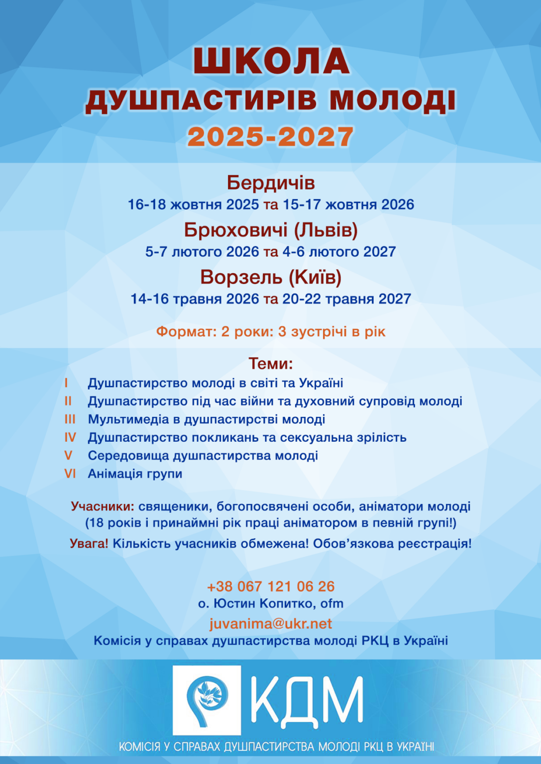 Комісія у справах душпастирства молоді розпочинає запис на Школу душпастирів молоді. Запрошуються священники, богопосвячені особи і миряни, які працюють з дітьми та молоддю, прийняти участь у навчанні, та отримати необхідні знання для кращого служіння.