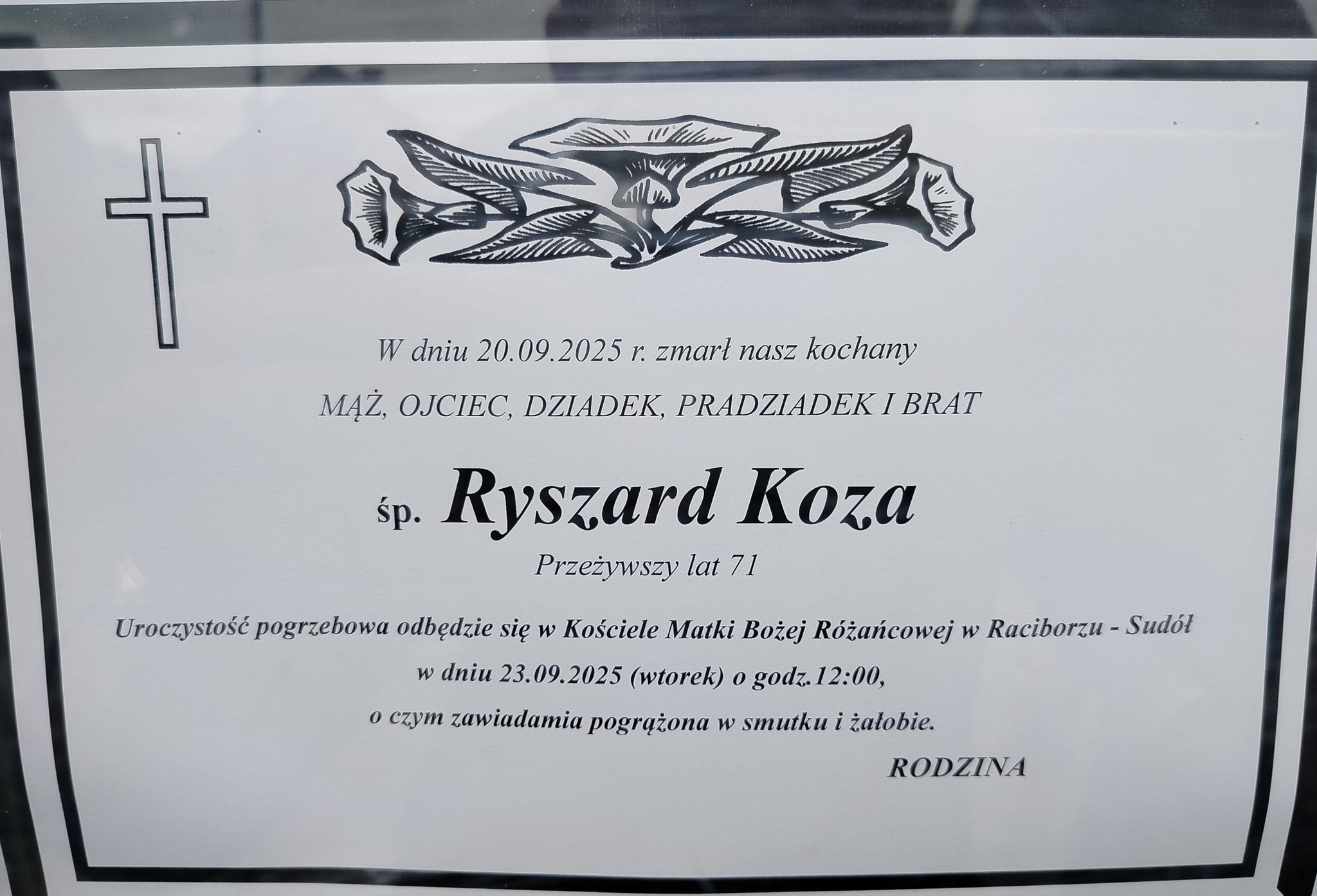 Річард Коза прожив 71 рік. Похоронні обряди відбудуться у вівторок, 23 вересня, у рідній парафії – у храмі Діви Марії Розарію у Раціборжу-Судолі. Початок о 12 годині за середньоєвропейським часом.