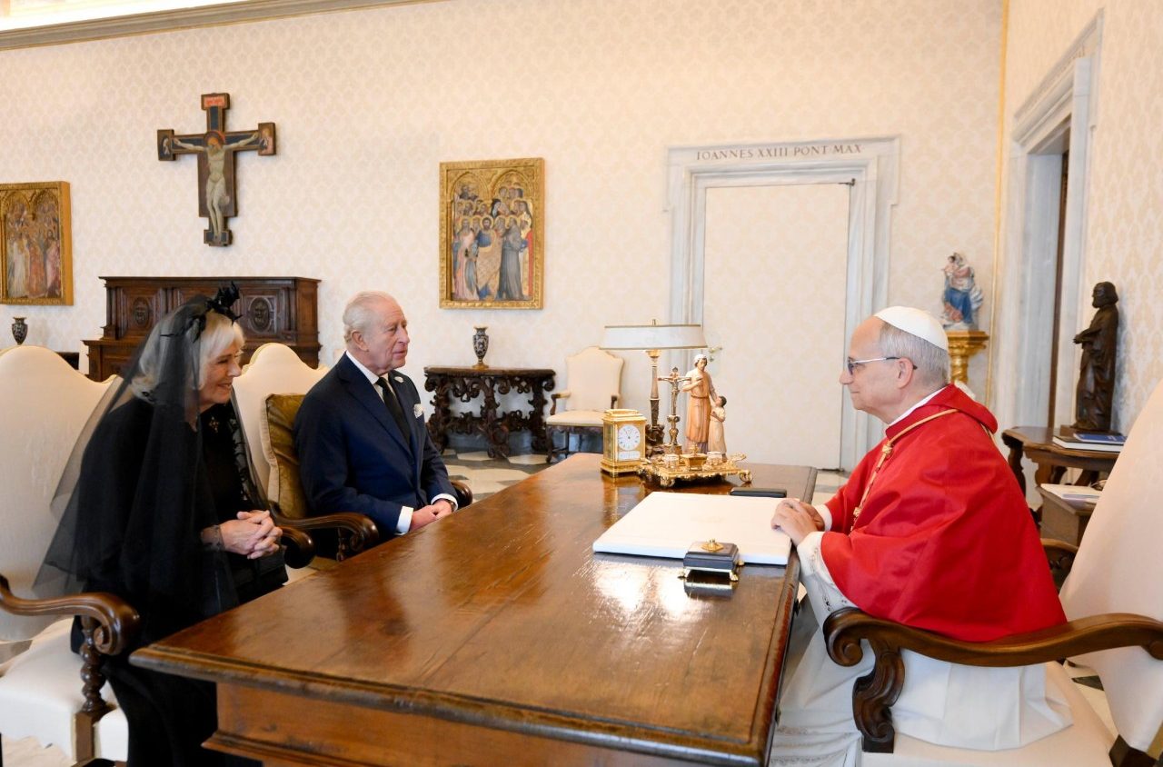 Королівська пара прибула до Ватикану о 10:50. Їх зустріли на внутрішньому подвірʼї Святого Дамазія, згідно з протоколом державних візитів. Після того, як оркестр Жандармерії виконав гімн «God Save the King», у супроводі почесної варти швейцарських гвардійців, король Чарльз III і королева Камілла увійшли до Апостольського палацу. Далі відбулася приватна аудієнція Папи з монархами, а потім кілька паралельних зустрічей: королева Камілла відвідала Паолінську каплицю, а король Чарльз провів переговори в Державному Секретаріаті з кардиналом П’єтро Пароліном.