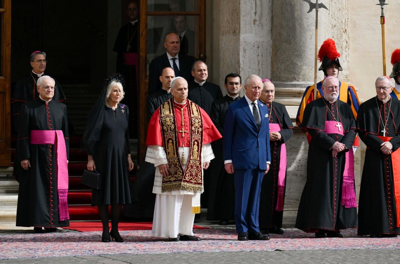 Королівська пара прибула до Ватикану о 10:50. Їх зустріли на внутрішньому подвірʼї Святого Дамазія, згідно з протоколом державних візитів. Після того, як оркестр Жандармерії виконав гімн «God Save the King», у супроводі почесної варти швейцарських гвардійців, король Чарльз III і королева Камілла увійшли до Апостольського палацу. Далі відбулася приватна аудієнція Папи з монархами, а потім кілька паралельних зустрічей: королева Камілла відвідала Паолінську каплицю, а король Чарльз провів переговори в Державному Секретаріаті з кардиналом П’єтро Пароліном.